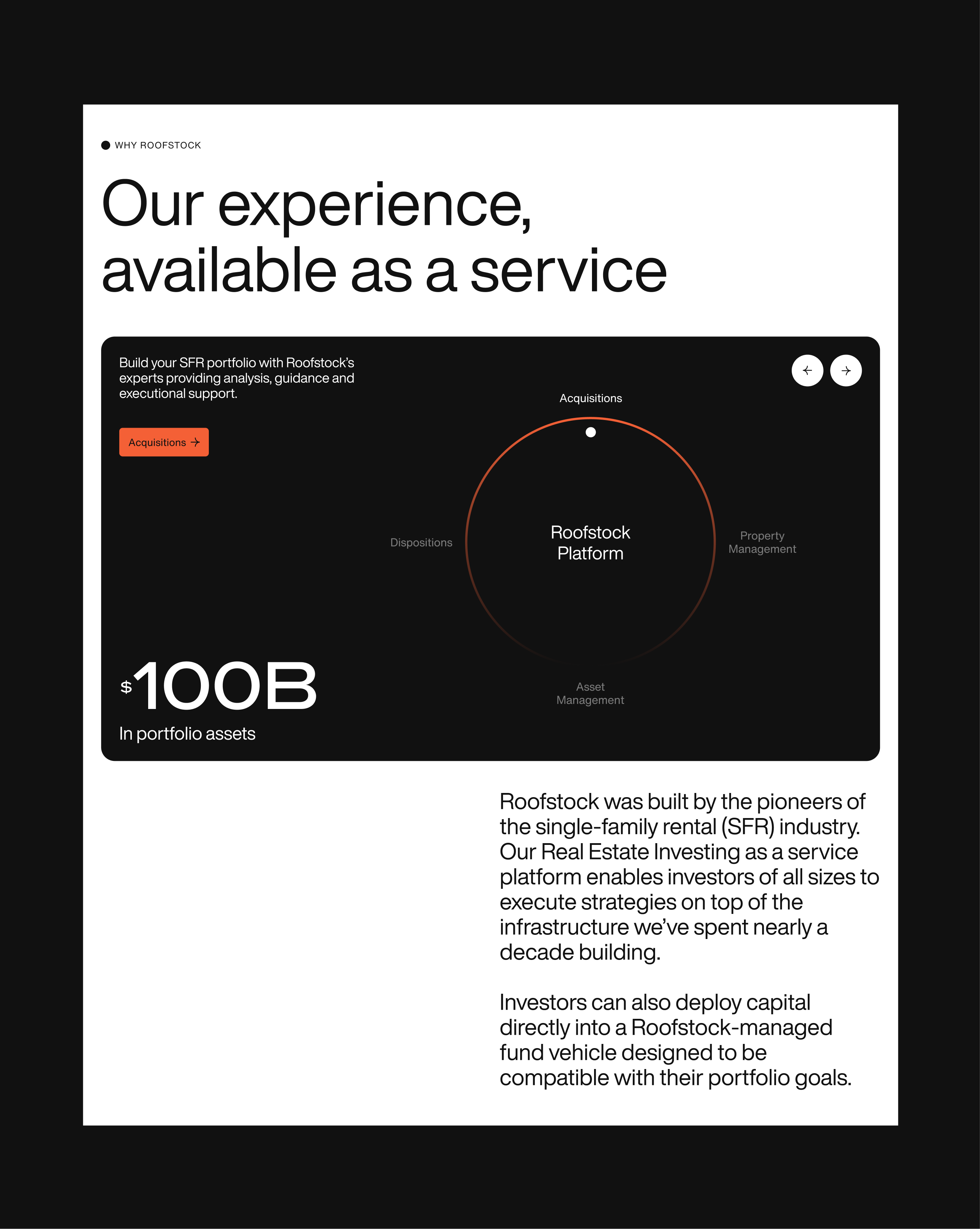 Roofstock is an online marketplace for buying and selling single-family rental properties as investments. As the company shifted from a consumer-focused marketplace to a broader platform serving institutional investors, our goal was to create a website that evolved with this change.