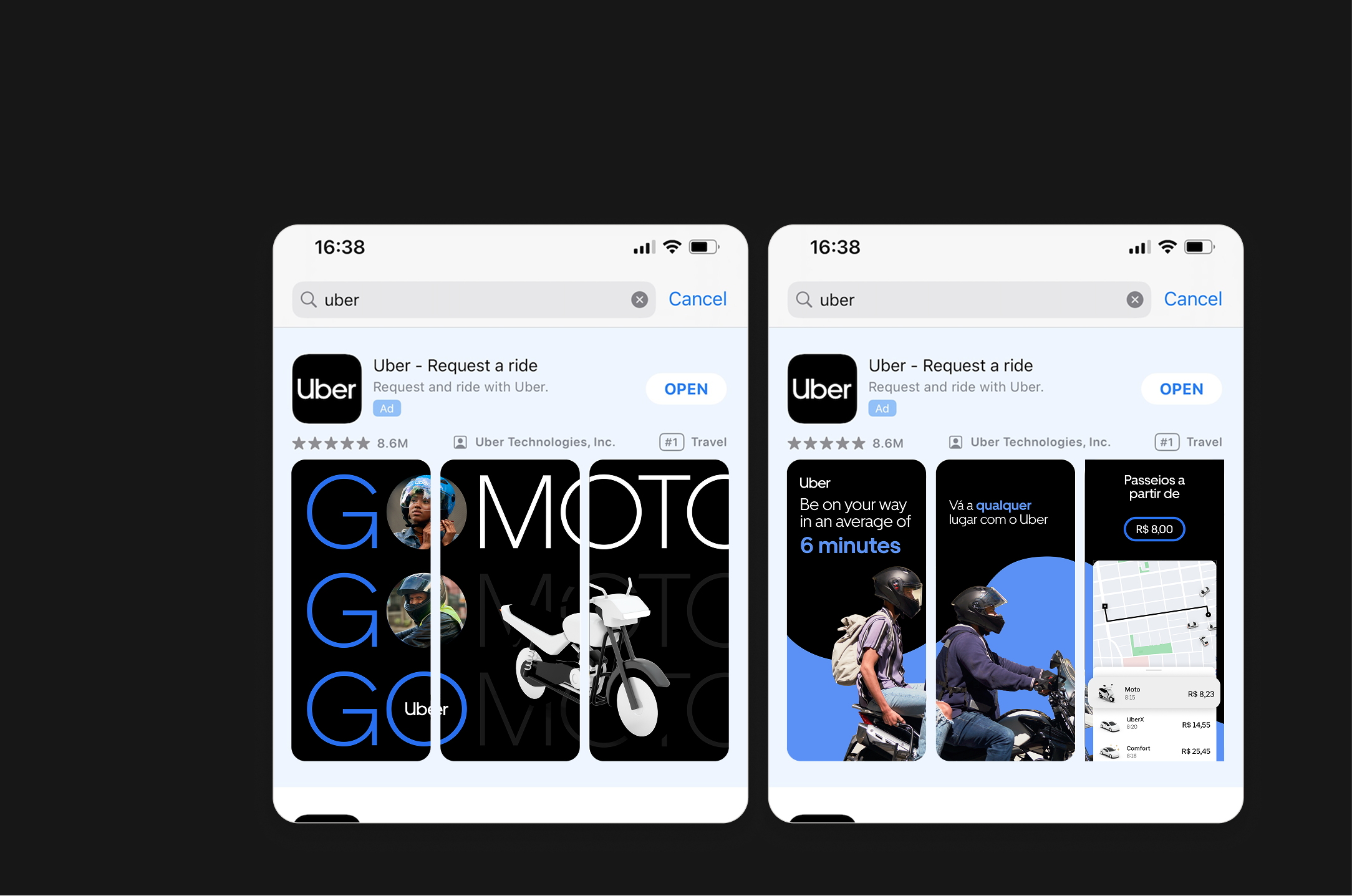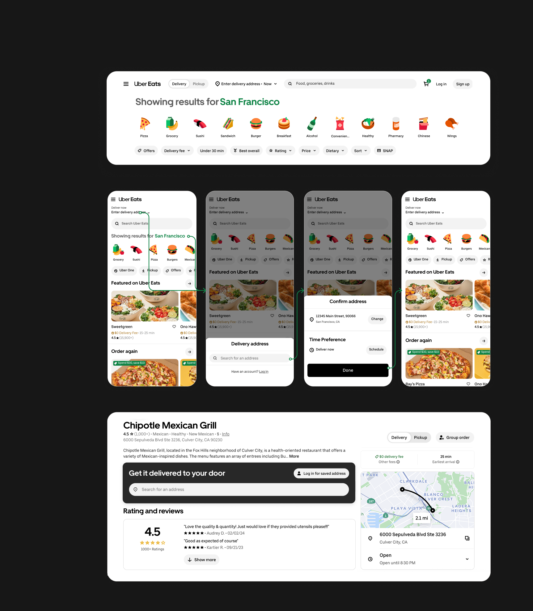 Our work involved various web solutions designed in collaboration with Uber’s web experience, growth platforms, and app store optimization teams. Utilizing Uber’s internal design systems, our team designed new user interfaces and flows for testing and live implementation.